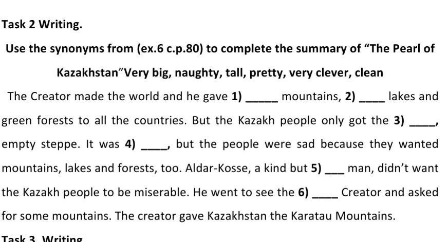 Use the synonyms from (ex.6 c.p.80) to complete the summary of “The Pearl of Kazakhstan”Very big, naughty, tall, pretty, very clever, clean