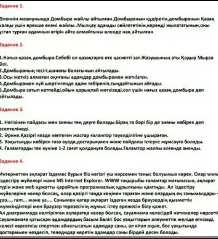 Задание 4. Иә,мен бұл пікірмен келісемін.Ғаламторда жақсы да жаман да жақтары. Жақсы жақтары: сен әртүрлі мақалалар мен керекті ақпараттарды таба аласыз, ұзақ өмір сүретін туыстарынмен сөйлесе аласың. Ал жаман жақтары: жаңалықтардың дұрыстығын білмейсін,сен кіммен сөйлесіп жатқанын ды білмейсін , басқа экранның жағында әрбір адам отыруы мүмкін. Сондықтан, Ғаламторда абай болуымыз қажет және әрбір адам мен сөйлеспеу қажет.