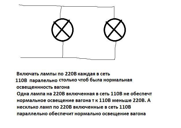 Одна лампа рассчитаное ан напряжение 220В выдержит напржение 110В. Но будет гореть тускло. Поэтому нужно несколько ламп на 220В включать параллельно в сеть 110Вб чтоб обеспечить номальное освешение вагона
