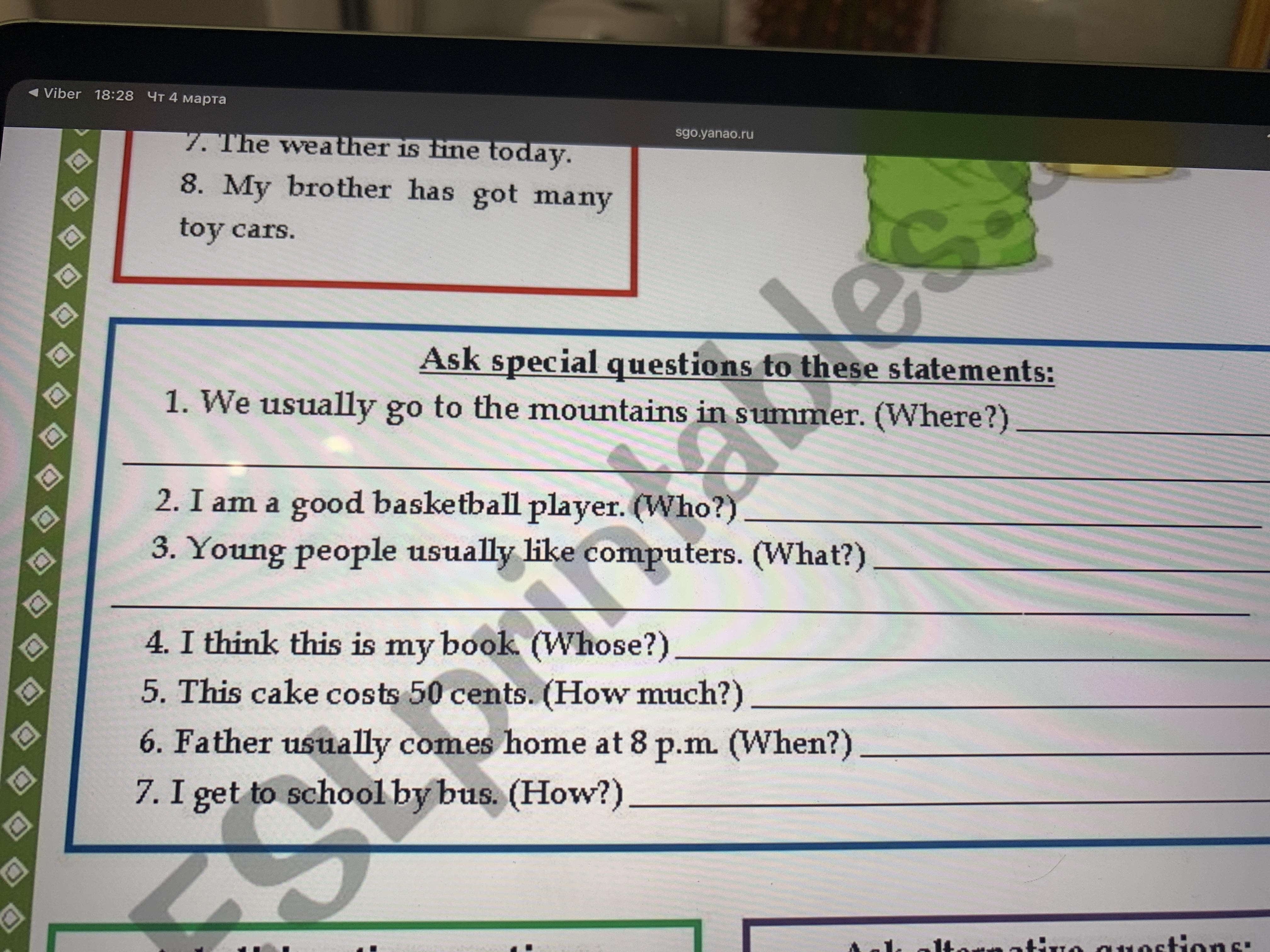 1. to the mountains 2. basketball player 3. computers 4. may 5. 50 cents 6. 8 pm 7. by bus