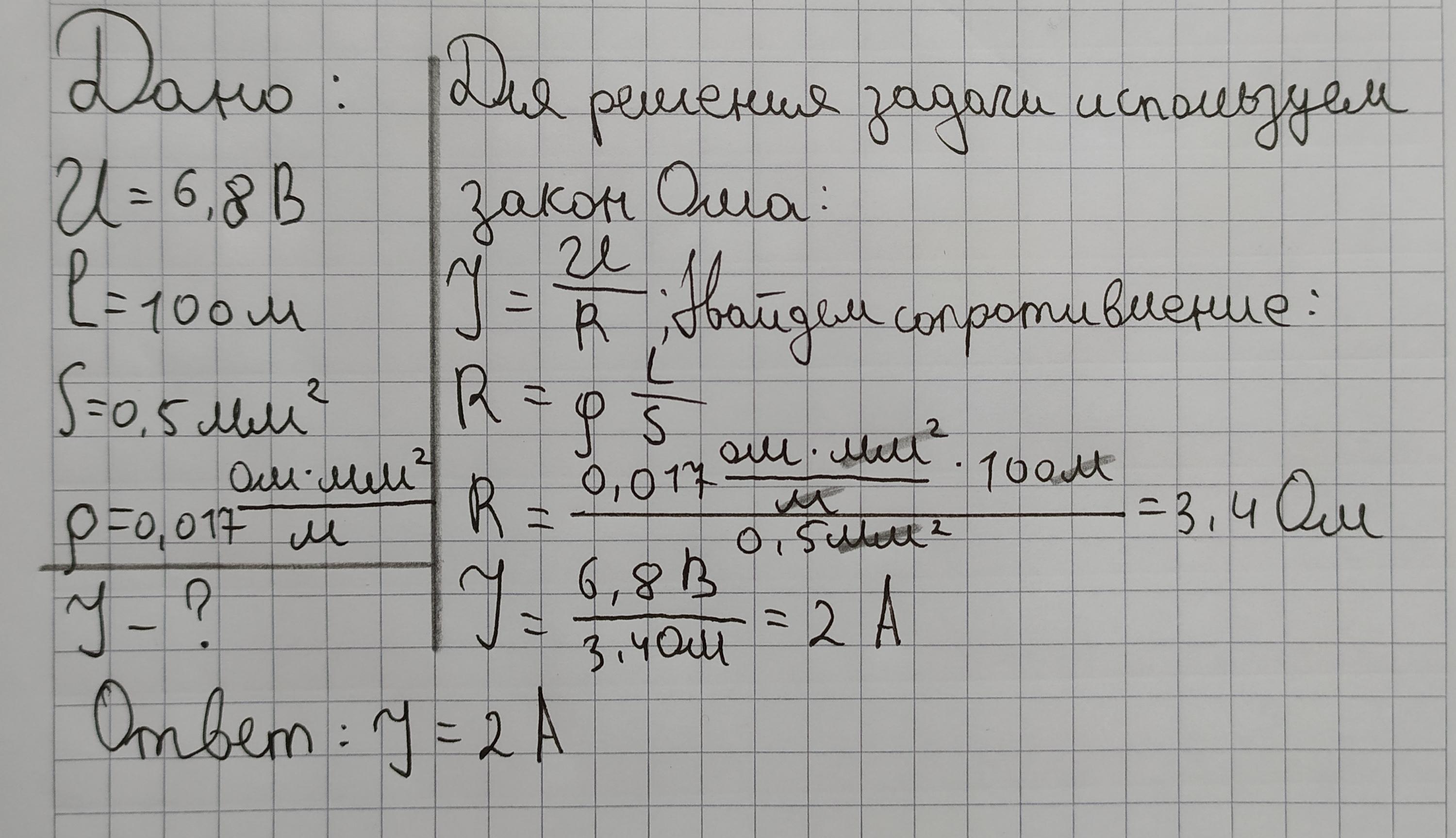 Рассчитайте силу тока, проходящего по медному проводнику длиной 100м и площадью поперечного сечения 0,5 мм2 (удельное сопротивление меди 1,68 * 10-8 Ом* м) Проводник включен в цепь постоянного тока напряжением 6,8 В
