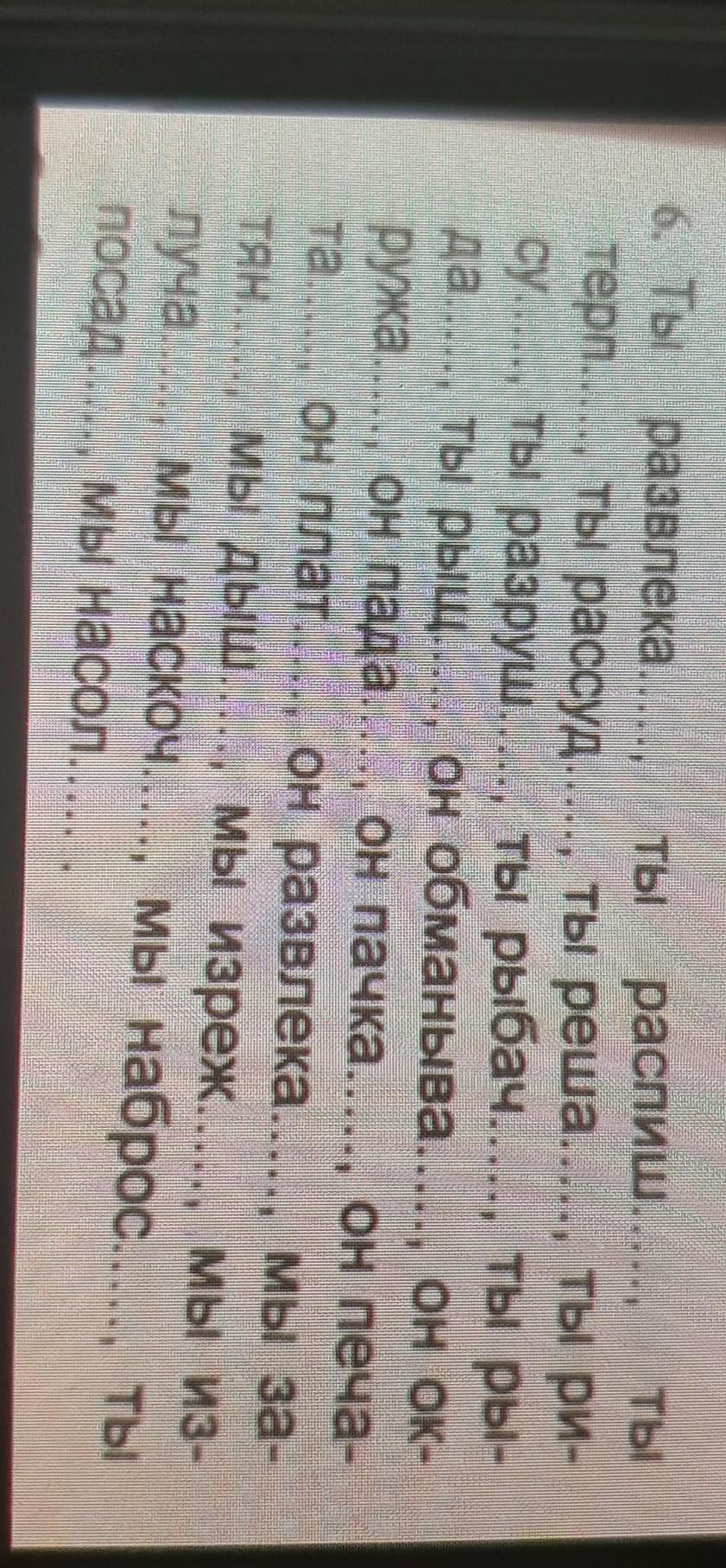 ты развлекаешь, ты распишешь, ты терпишь, ты рассудишь, ты решаешь, ты рисуешь, ты разрушишь, ты рыбачишь, ты рыдаешь, ты рыщешь, он обманывает, он окружает, он падает, он пачкает, он печатает, он платит, он развлекает, мы затянем, мы дышим, мы изрежем, мы излучаем, мы наскочим, мы набросим, ты посадишь, мы насолим