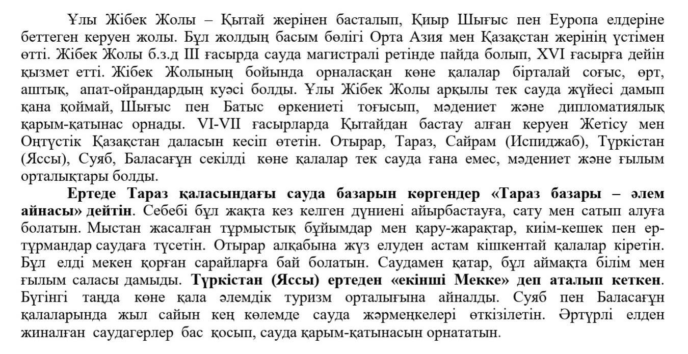 1)Ұлы Жібек Жолы - Қытай жерінен басталып, Қиыр Шығыс пен Еуропа елдеріне беттеген керуен жолы.