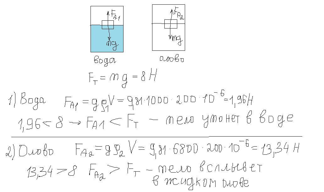 Определите утонет ли тело в воде и в жидком олово если его объем 200 см3? Вес тела 8 Н. Плотность воды 1000 кг/м3, плотность жидкого олова 6800 кг/м3.