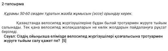 Құрамы 50-60 сөзден тұратын жазба жұмысын (эссе) орындау керек.