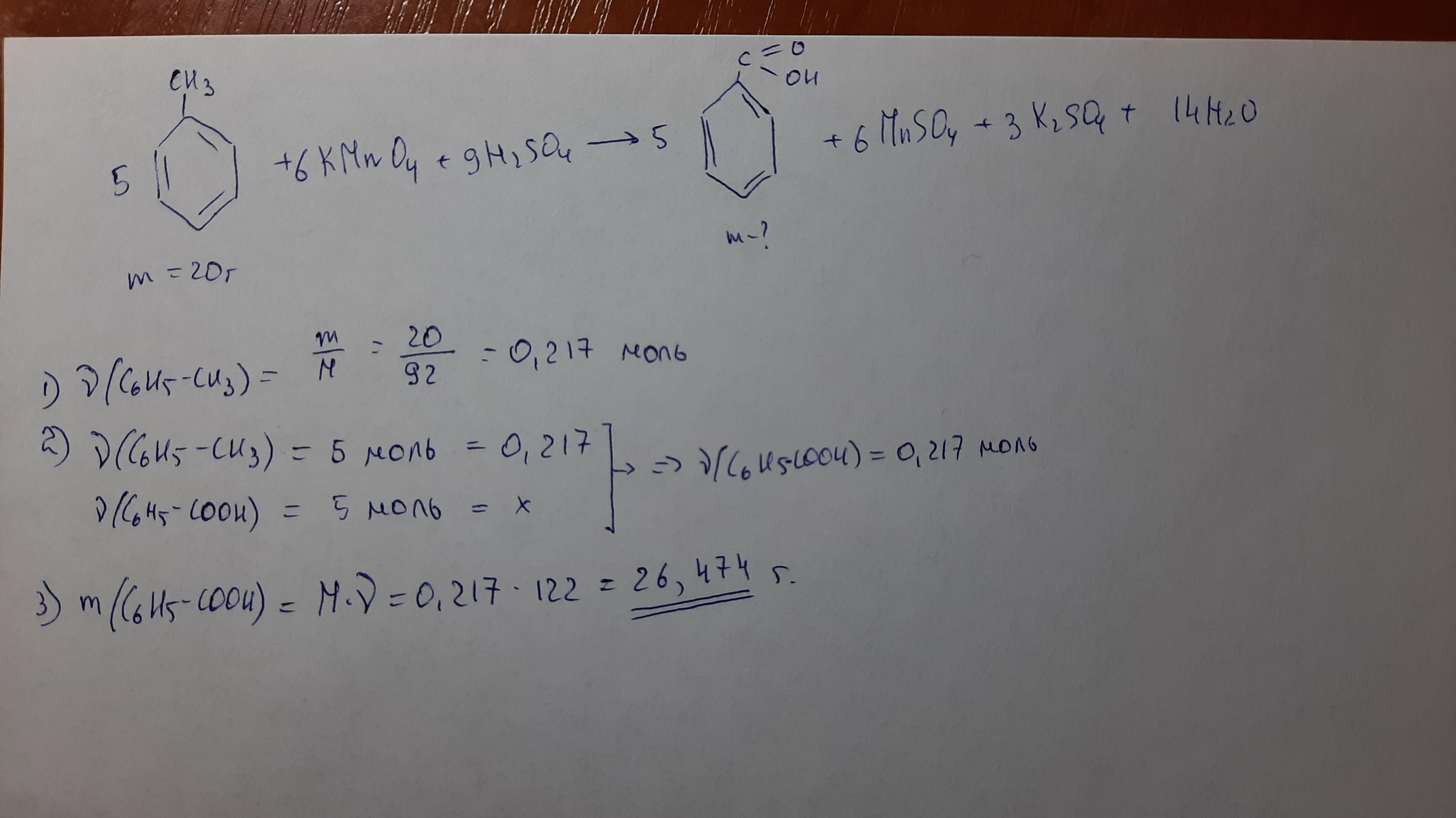 Сколько граммов бензойной кислоты образуется при окислении 20г толуола перманганатом калия?