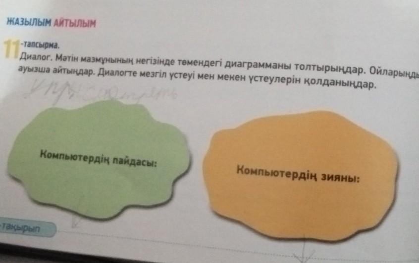 Диалог. Мәтін мазмұнының негізінде төмендегі диаграмманы толтырыңдар. Ойларыңды
