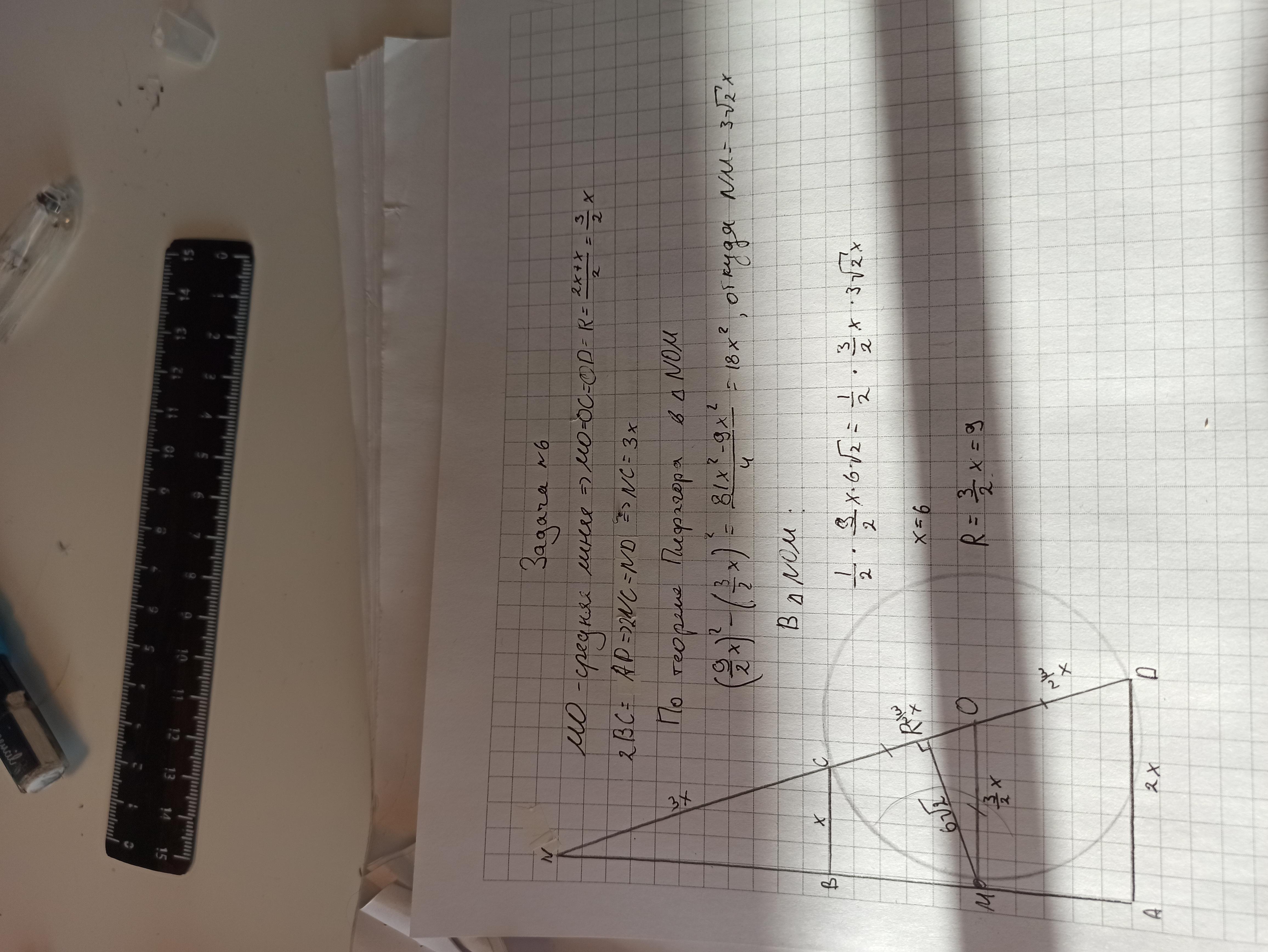 В прямоугольной трапеции `ABCD` основание `AD` в два раза больше основания `BC`. Окружность, построенная на большей боковой стороне `CD` как на диаметре, касается стороны `AB` в точке `M`. Расстояние от точки `M` до стороны `CD` равно $$6\sqrt{2}$$. Найти радиус окружности.