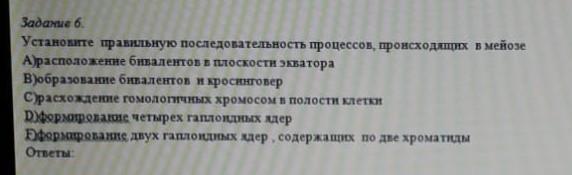Установите правильную последовательность процессов,происходящих в мейозе.Дайте ответ скорее пожалуйста..