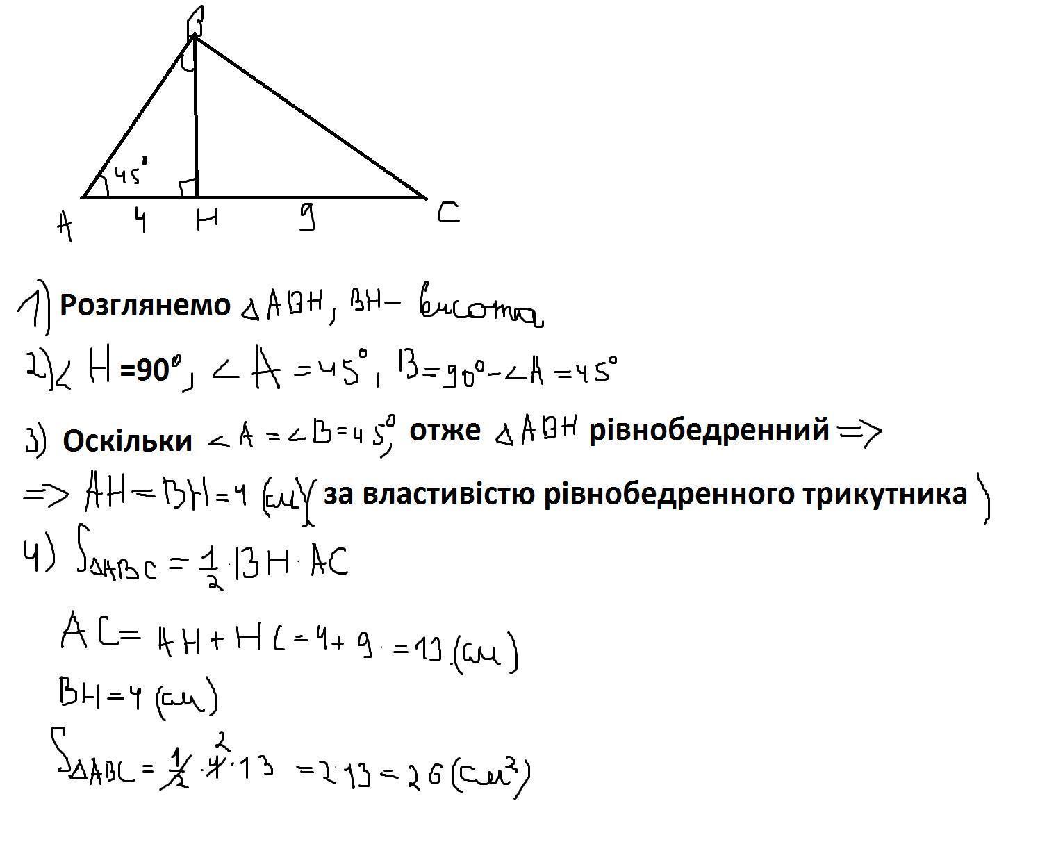 В треугольнике АВС ⦟А=45º, а высота ВН делит сторону на отрезки АН и НС соответственные равные 8 см и 12 см. Найдите площадь треугольника АВС.