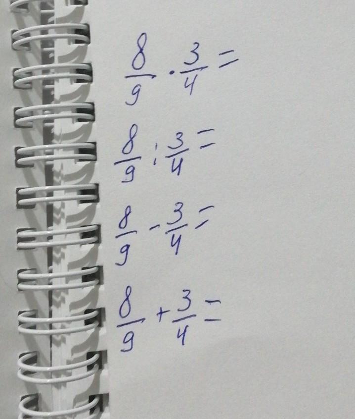 Для вычитания и сложения надо найти общий знаменатель. Тут он 36. Получается первую дробь надо умножить на 4, а вторую на 9. получаться дроби 32/36 и 27/36 и потом сложить или вычесть числители. А для умножения и деления надо умножить числитель первой и второй дроби и знаменатель первой и второй. То есть 8/9 *3/4 это 8*3 и 9*4 = числитель 24 и знаменатель 36. Ответ: (в умножении) 24/36. Понятно?