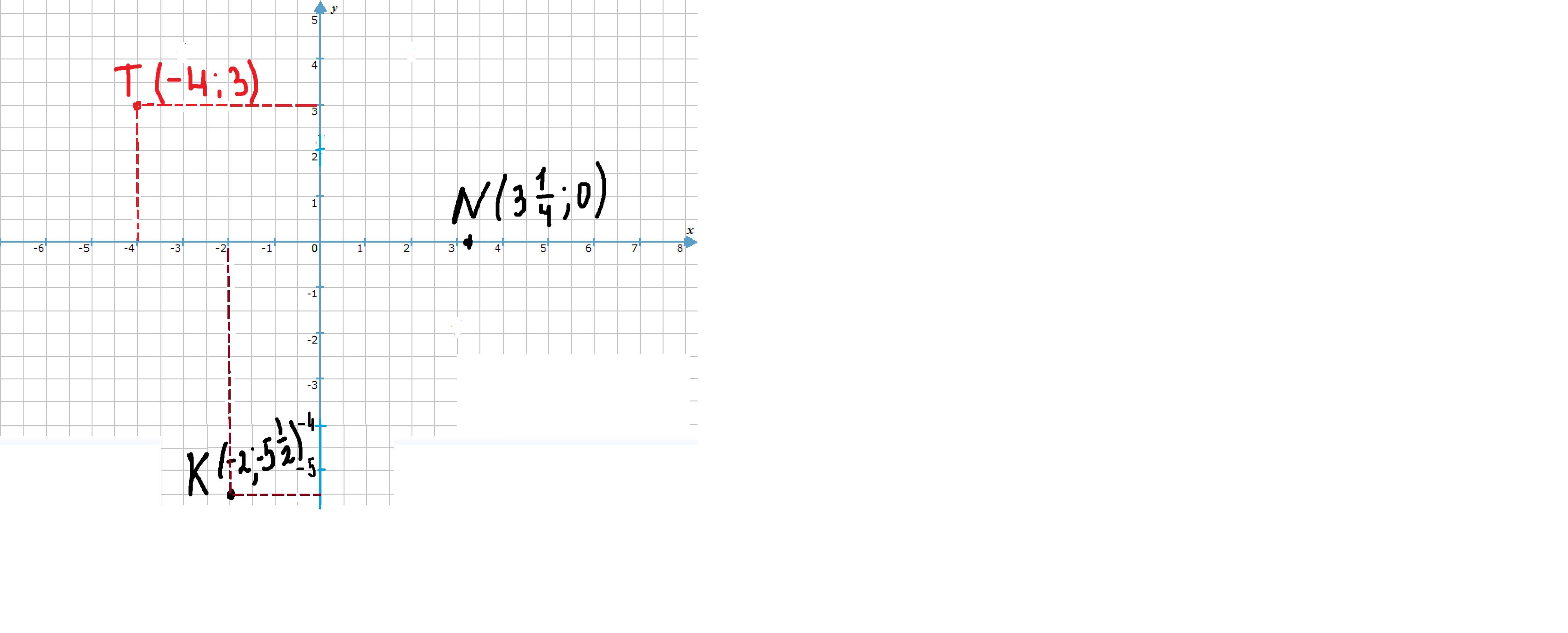 Начертите систему координат, приняв за единичный отрезок на каждой оси две клетки тетради . Отметьте на координатной плоскости точки с координатами : Т(-4;3); К(-2; -5 1/2); N(3 1/4 ; 0)