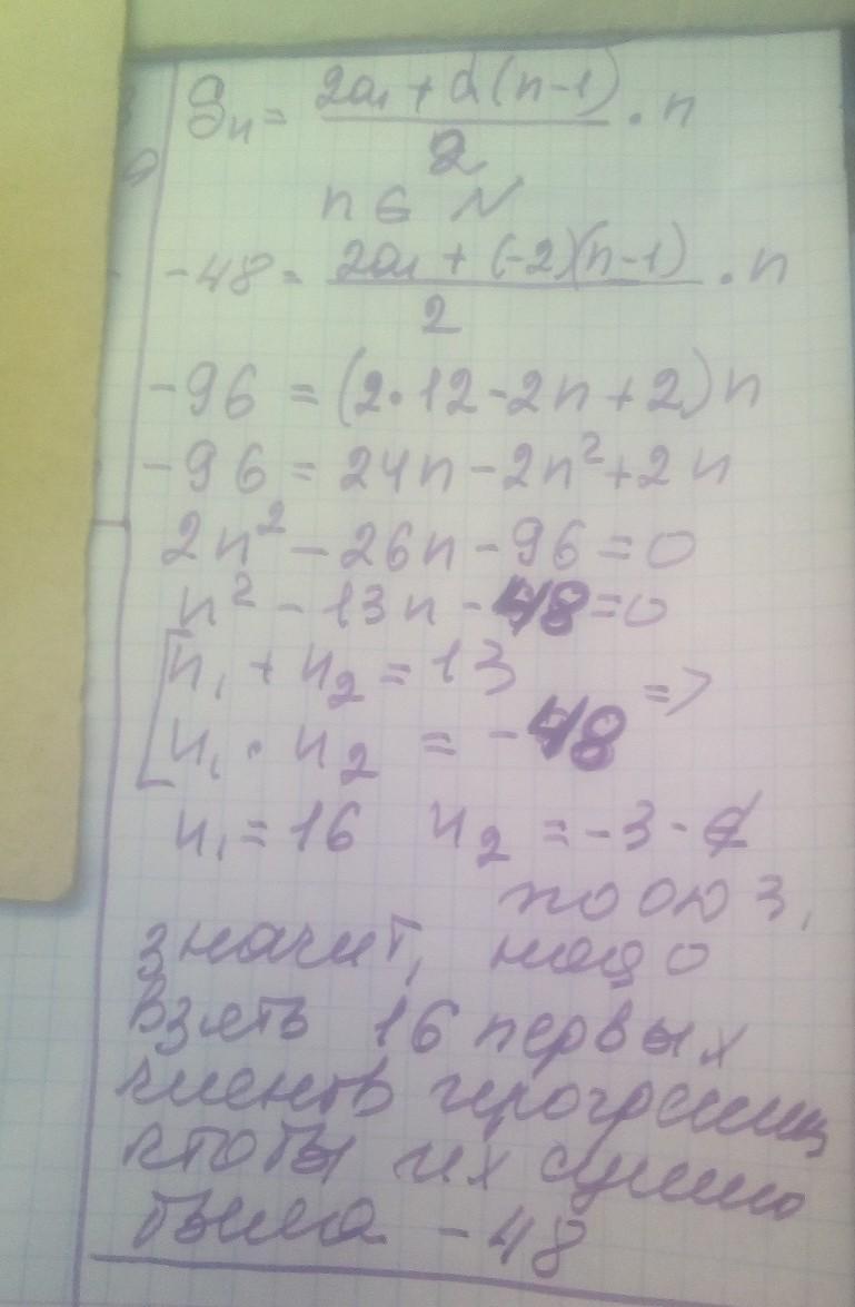 Первый член арифметической прогрессии равен 12, а ее разность равна -2. Сколько надо взять первых членов прогрессии чтобы их сумма была равной -48