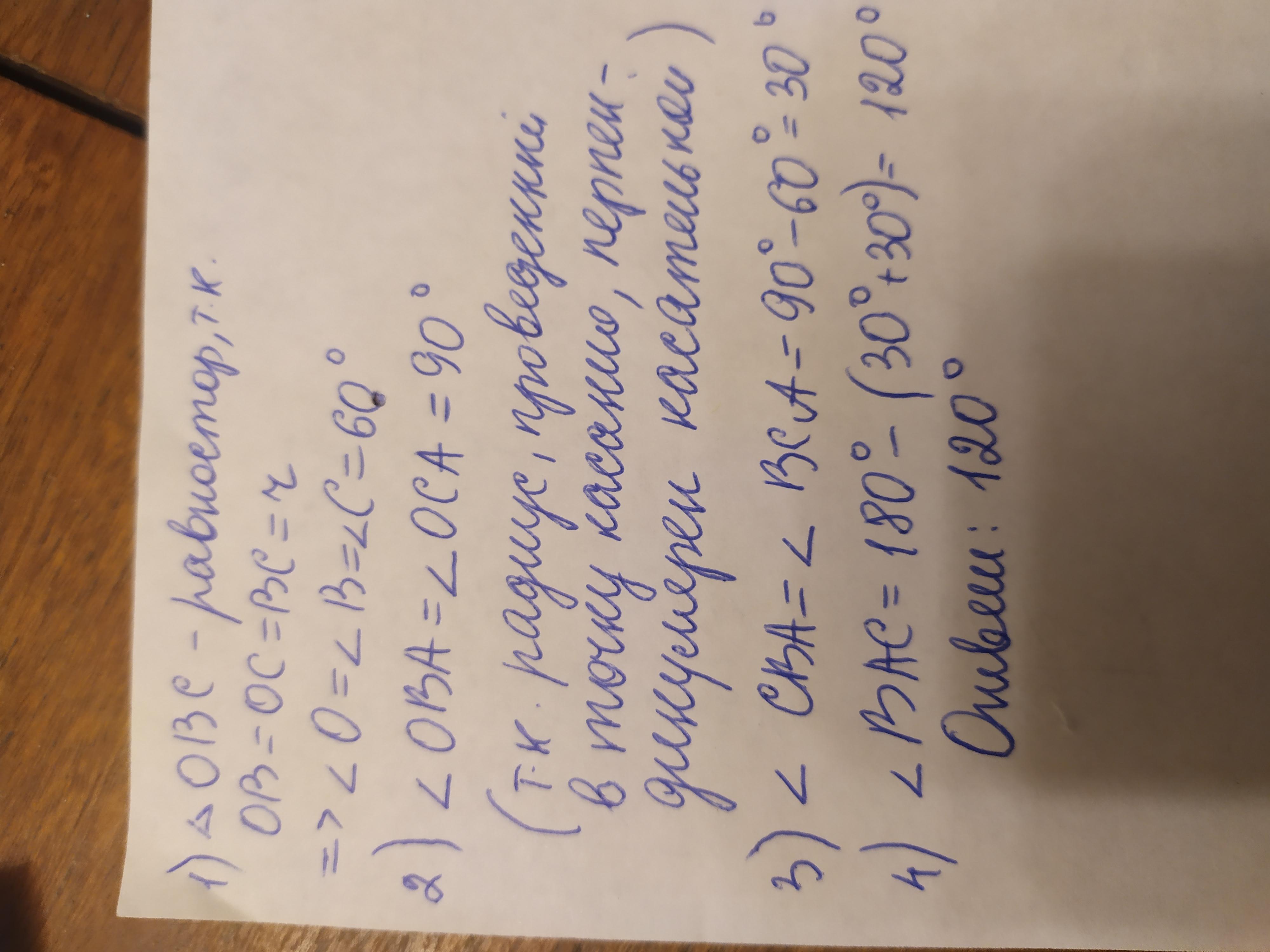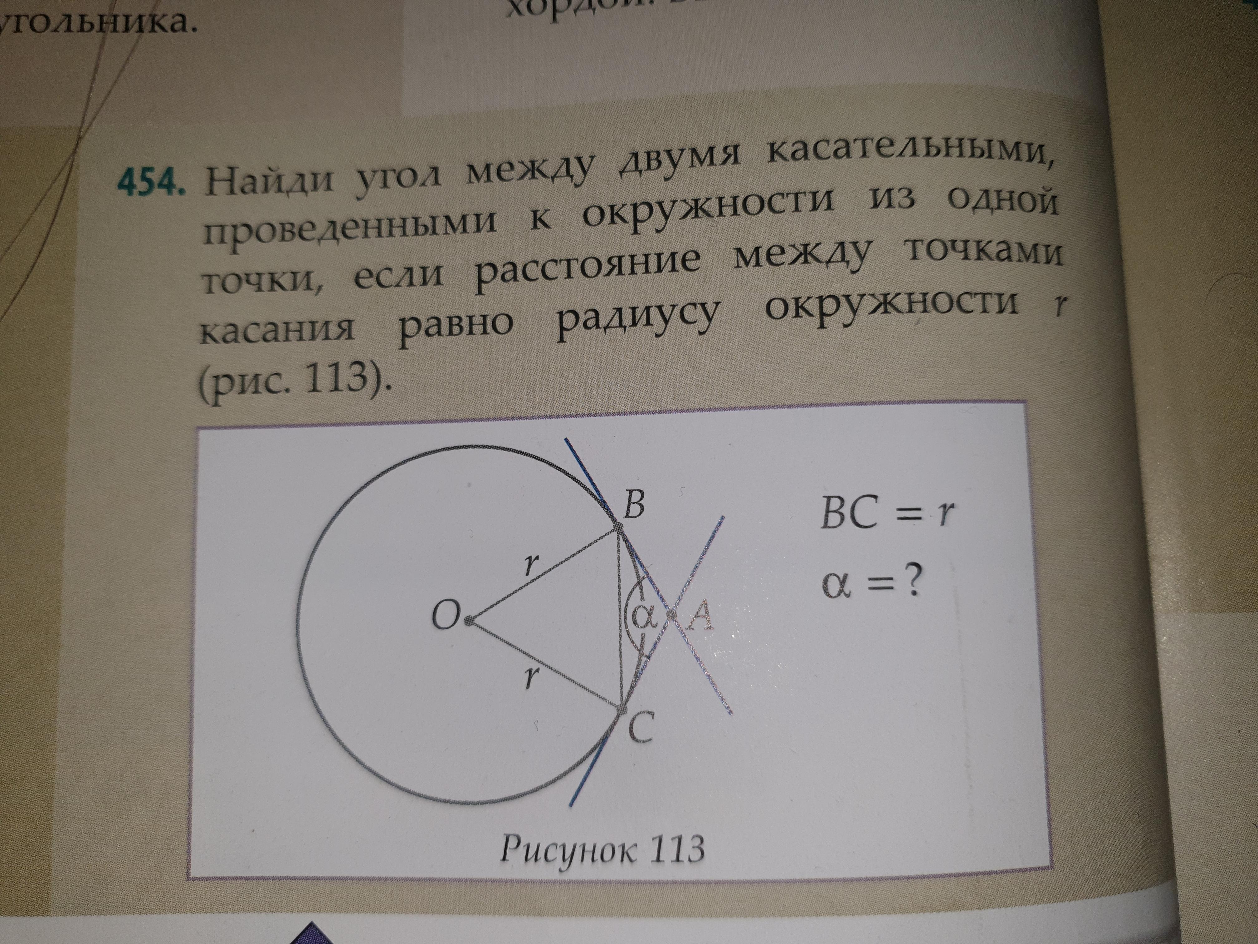Найди угол между двумя касательными, проведенными к окружности из одной точки, если расстояние между точками касания равно радиусу окружности r