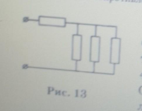 На рисунке 13 приведено соединение четырех одинаковых сопротивлений,каждое из которых равно 4 Ом. Напряжение на клеммах 12 В. Определите общее сопротивление и силу тока в цепи