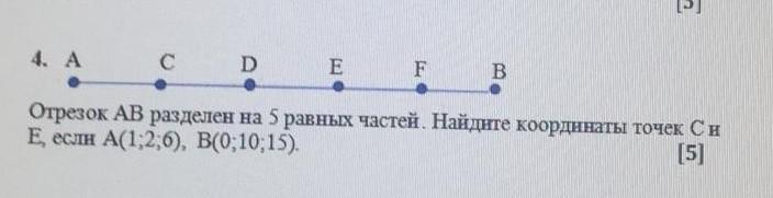 Помогите пожалуйста срочно даю 50 баллов!!!!!! Отрезок АВ разделён на 5 равных частей. Найдите координаты точек С и Е, если А (1;2;6), В(0;10;15,)