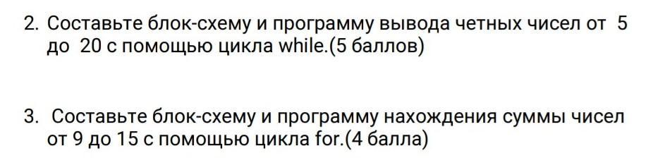 Хотябы одно из этого.....Составьте блок-схему и программу вывода четных чисел от 5