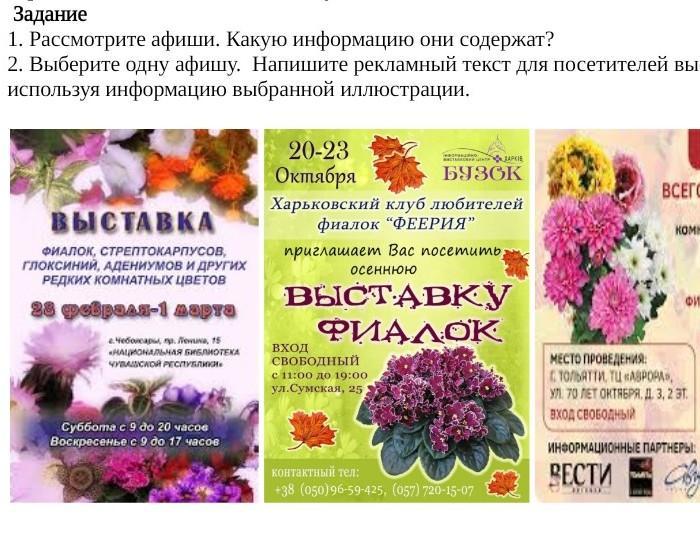 2. Выберите одну афишу. Напишите рекламный текст для посетителей выставки цветов , используя информацию выбранной иллюстрации
