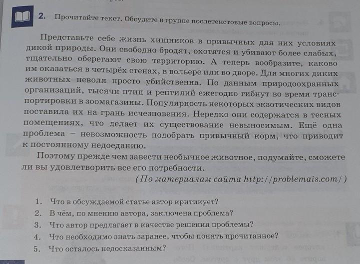 1) Автор критирует что хищники охотяца на слабых животных. Чтоб мы защищать их чтоб они были в безопасности. 2) Проблема заключается в том что хичники убивают и охотятся на на слабых животных. И за этого животных становится меньше. И подобрания привычного корма и это приводит к недостатку пищи. 3) Поэтому прежде чем зависти необычное животное подумайте сможете ли вы удотворить все его потребности. 4) незнаю. 5) сам придумай.