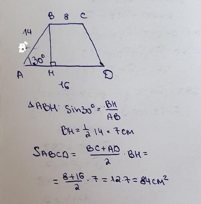. Основания трапеции равны 8 см и 16 см, а боковая сторона равная 14 см, образует с одним из оснований трапеции угол равный 30°. Найдите площадь трапеции.