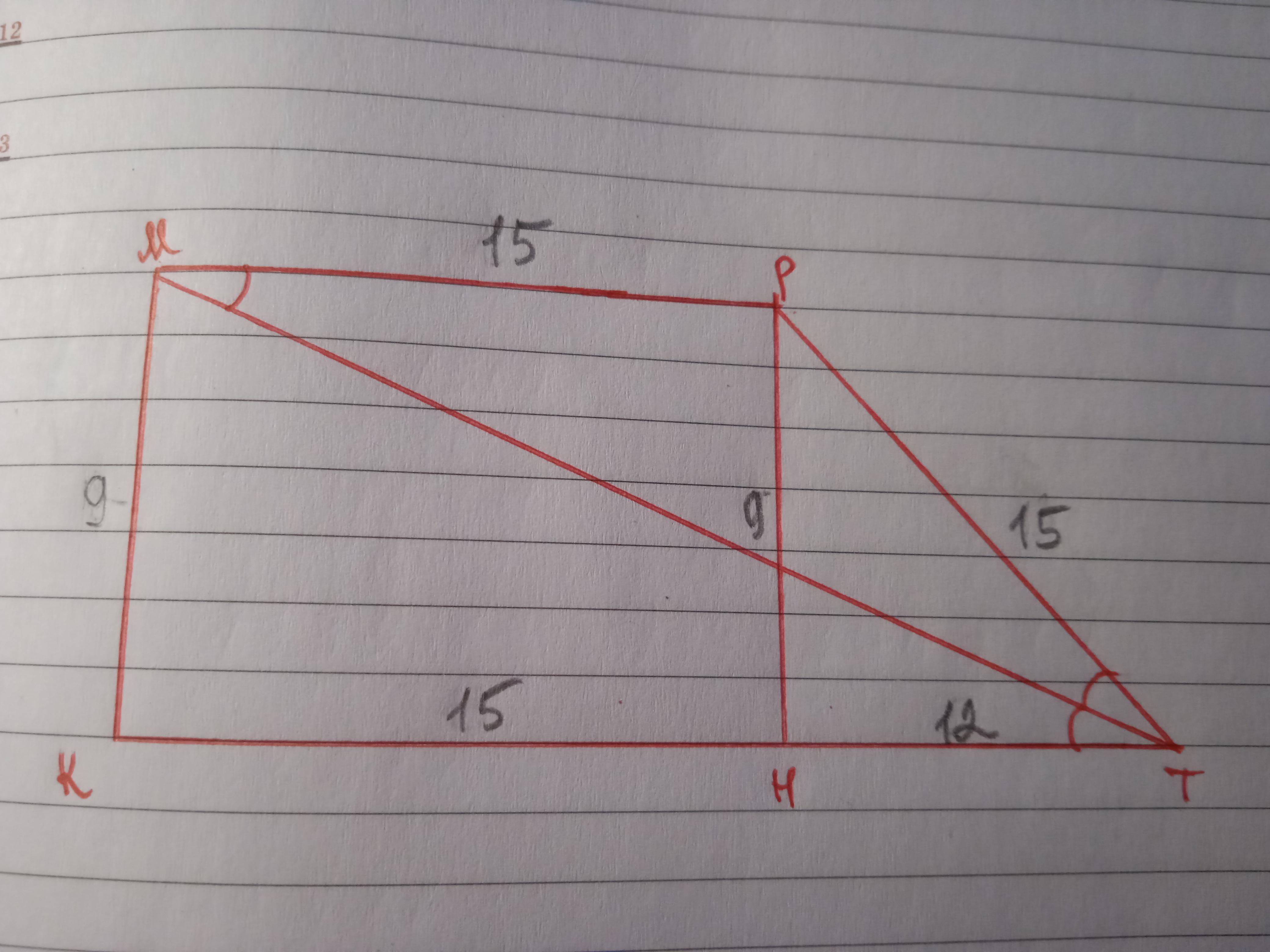 Дано: КМРТ - трапеция, МК⊥КТ, МК=9 см, РТ=15 см. МТ - биссектриса. Найти S(КМРТ).