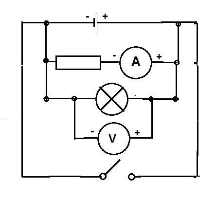 К батарейке параллельно присоединены лампочка и резистор. На лампочке измеряется напряжение, на резисторе сила тока Начертить электрическую схему этого соединения