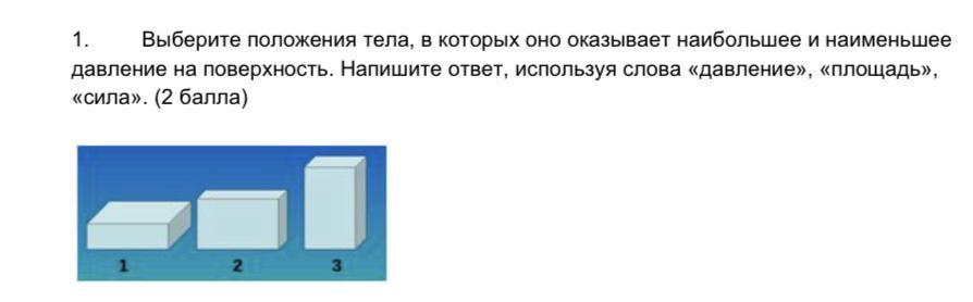 Выберите положения тела, в которых оно оказывает наибольшее и наименьшее давление на поверхность. Напишите ответ, используя слова «давление», «площадь», «сила». (2 балла) ПОМОГИТЕ ПОЖАЛУЙСТА МНЕ СРОЧНО!!!
