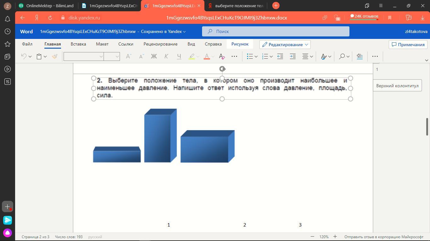 Ответ: Давление наибольшее и наименьшее это на 2 картинке площадь больше чем остальных и при этом сил у него много потому что приведём пример: человек который стоит 2 ногами весить 40кг, 2 человек с 1 ногой весить 80кг это значить что сила, давления, площадь подходить только на 2 картинку