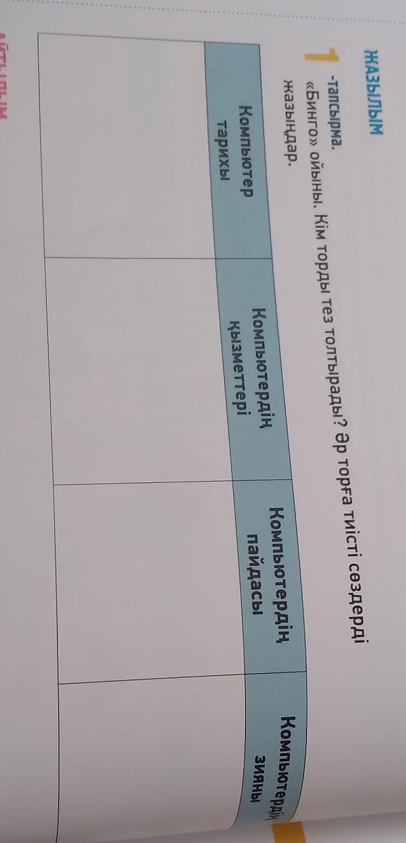 «Бинго» ойыны. Кім торды тез толтырады? Әр торға тиісті сөздерді жазыңдар.