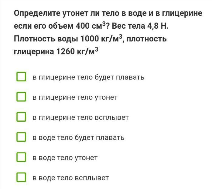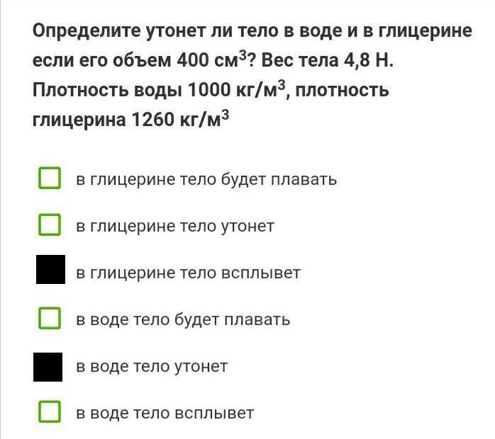 Fₐ₁ = ρ₁·g·V = 1000·10·400·10⁻⁶ = 4 Н