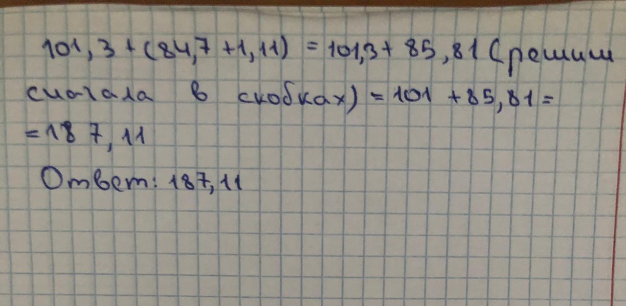 будет удобнее решить так: (101,3+84,7)+1,11= 186+1,11= 187,11