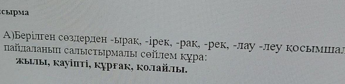 А)Берілген сөздерден -ырак, -ірек, -рак, -рек, -лау -леу қосымшаларын