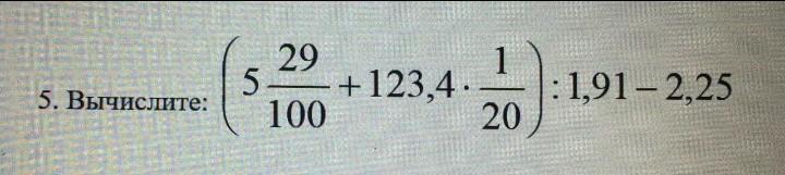 ( 5 29/100+123,4×1/20):1,91-2,25= (5,29+123,4*0,05) :1,91=(5,29+6,17) :1,91= 11,46: 1,91= 6