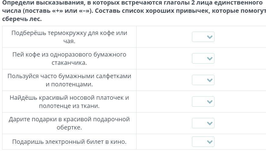 Определи высказывания, в которых встречаются глаголы 2 лица единственного числа (поставь «+» или «–»). Составь список хороших привычек, которые помогут сберечь лес. Подберёшь термокружку для кофе или чая. Пей кофе из одноразового бумажного стаканчика. Пользуйся часто бумажными салфетками и полотенцами. Найдёшь красивый носовой платочек и полотенце из ткани. Дарите подарки в красивой подарочной обертке. Подаришь электронный билет в кино.