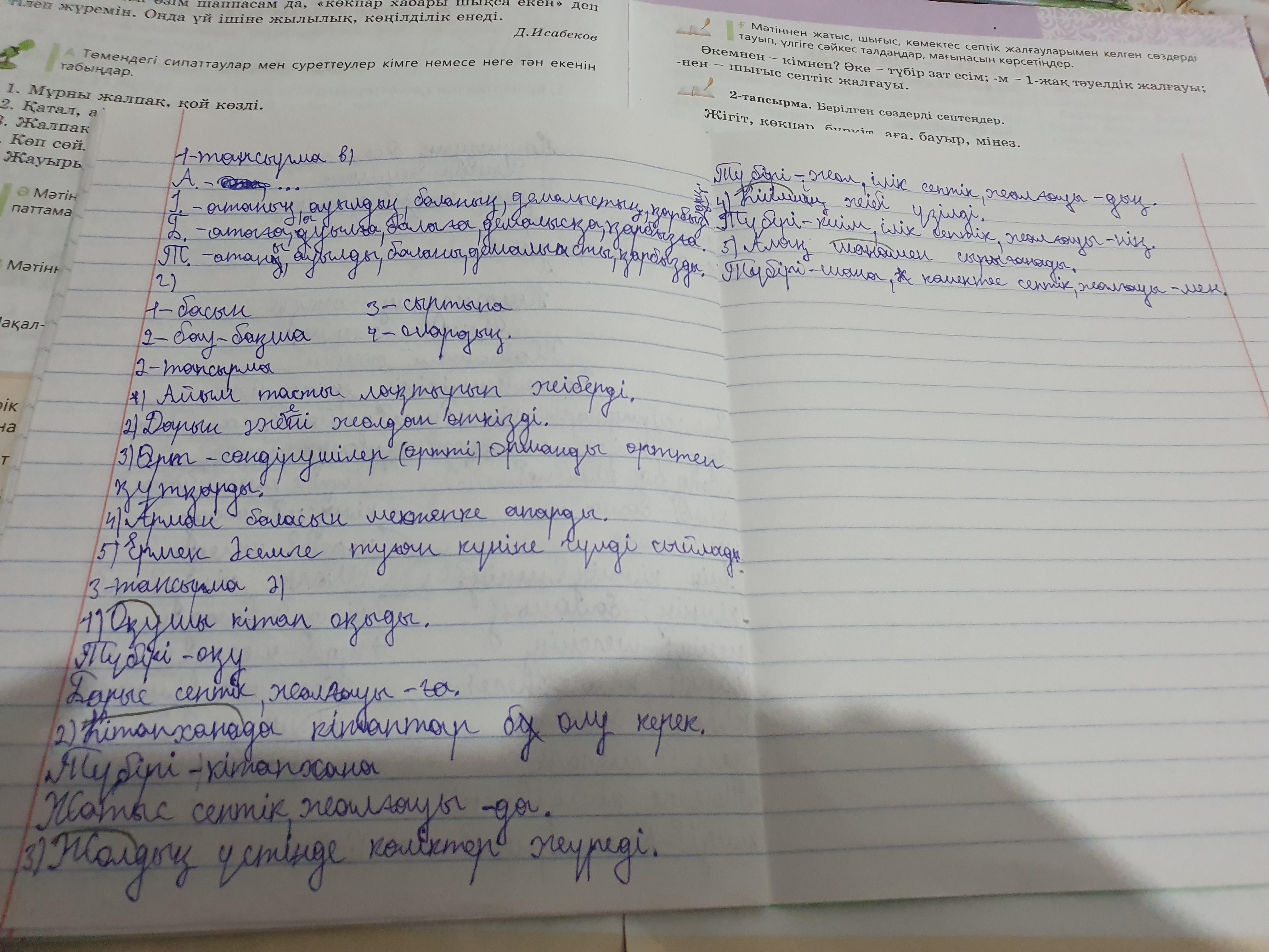 Мәтінді қайта тыңдап, бес зат есім жазыңдар. Ол сөздерді түбір мен қосым-