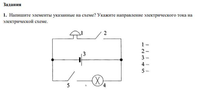 Напишите элементы указанные на схеме? Укажите направление электрического тока на