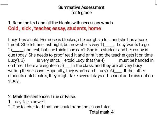 Если что вот порядок пропущенных слов в тексте:Sick,Home, Teacher,Essay, Students,Cold