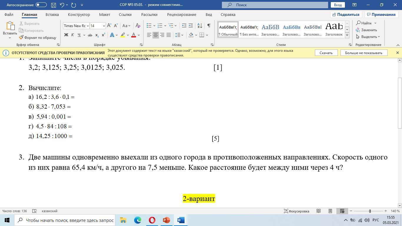 3. Две машины одновременно выехали из одного города в противоположенных направлениях. Скорость одного из них равна 65,4 км/ч, а другого на 7,5 меньше. Какое расстояние будет между ними через 4 ч? Ответ: 1) 65.4 * 4 = 261.6 2) 57.9 * 4 = 231.6 3) 261.6 + 231.6 = 493.2 км