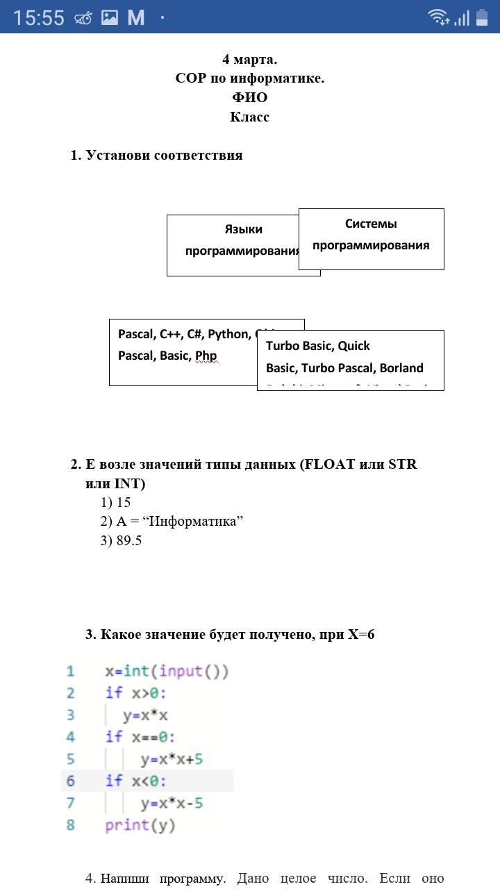 4. Напиши программу. Дано целое число. Если оно является положительным, то прибавить к нему 4; если отрицательным, то вычесть из него 2; если нулевым, то заменить его на 20. Вывести полученное число.