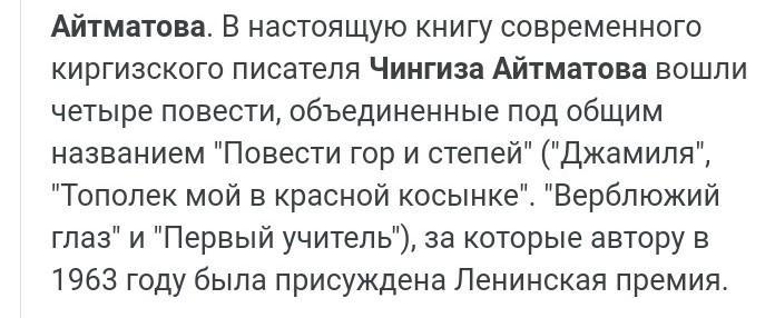 Айтматова. В настоящую книгу современного киргизского писателя Чингиза Айтматова вошли четыре повести, объединенные под общим названием "Повести гор и степей" ("Джамиля", "Тополек мой в красной косынке". "Верблюжий глаз" и "Первый учитель"), за которые автору в 1963 году была присуждена Ленинская премия.