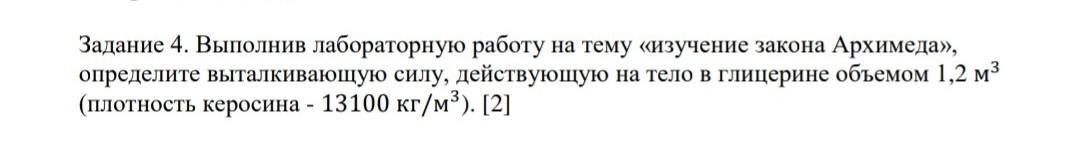 определите выталкивающую силу, действующую на тело в глицерине объемом 1,2 м