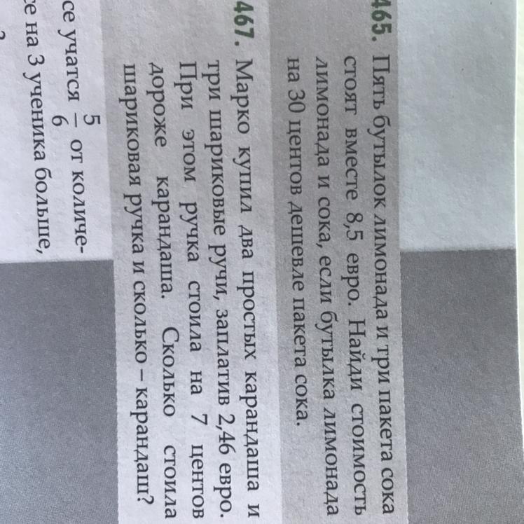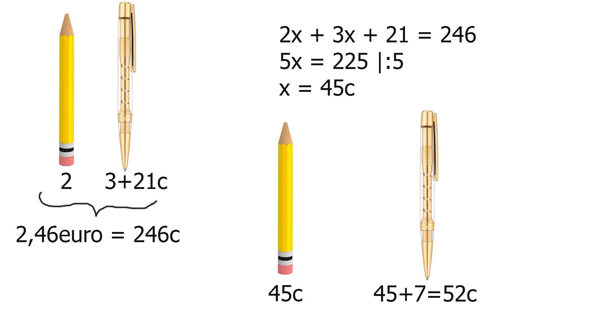 Пусть один карандаш будет стоить х,тогда ручка 7+х, 2,46 евро=246 центов 2х+3(7+х)=246 2х+21+3х=246 5х=225 х=45 центов-карандаш,45+7=52 цента-ручка