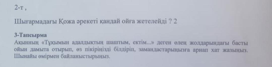Акынның «Тұқымын адалдыктын шаптым, ектім...» деген өлең жолдарындағы басты ойын дамыта отырып, өз пікірінізді білдіріп, замандастарыңызға арнап хат жазыңыз. Шынайы өмірмен байланыстырыңыз.