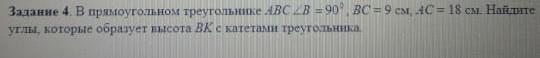 В прямоугольном треугольнике ABC √B=90, BC-9 см, АС 18. Найдите углы которые образует высота ВК с катетами треугольника