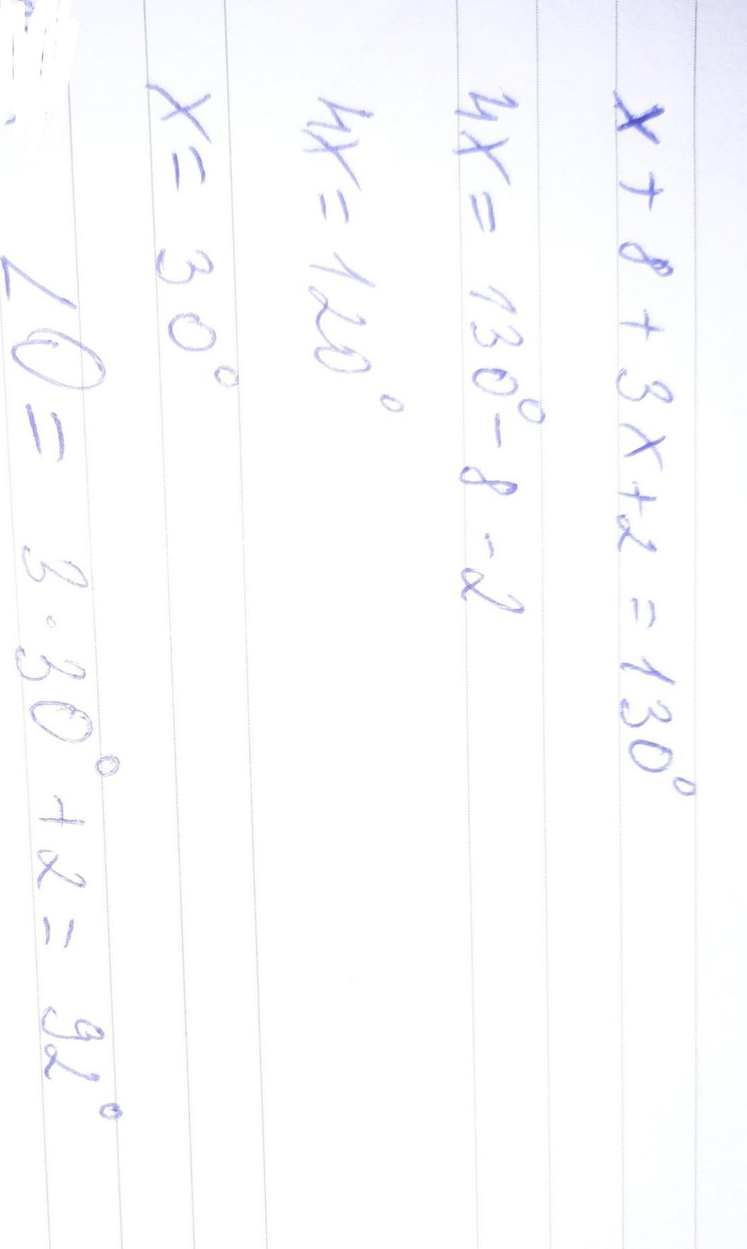 130=(x+8) + (3x+2); x=30; O=3x+2=92;