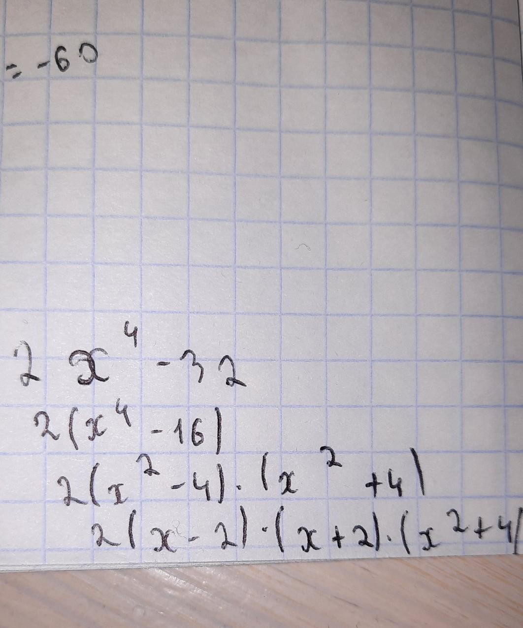 2х⁴-32=2( (х²)²-4²)=2(х²-4)(х²+4)=2(х-2)(х+2)(х²+4)