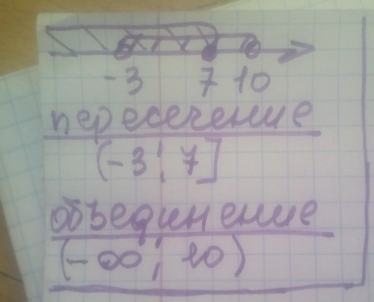 Изобразите на координатной прямой и запишите пересечение и объединение числовых промежутков: ( – 3; 10) и (−∞; 7]
