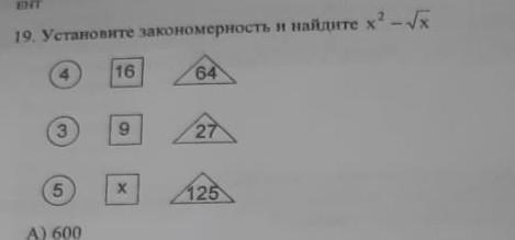 закономерность: в кружке - число, в квадрате - это число во второй степени, в треугольнике - это число в третьей степени. значит в третьей строке х=25.
