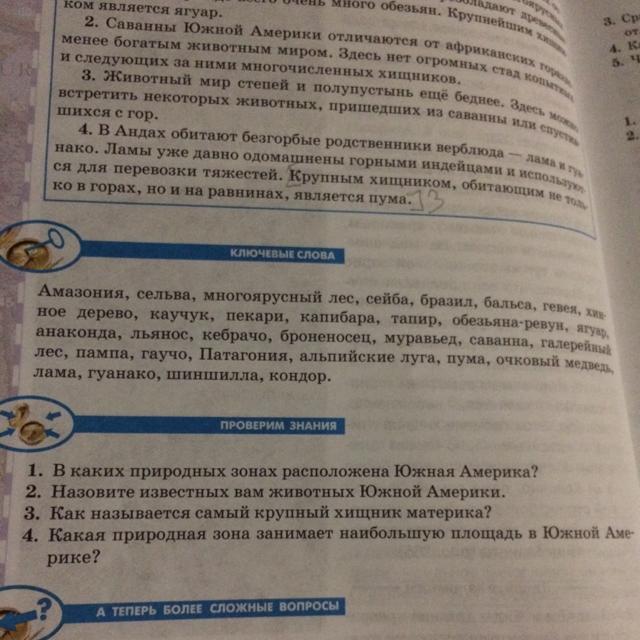 1) влажные экваториальные леса, саванна, зона степей, полупустыни, горные районы. 2) броненосец, пума, лама, шиншилла, капибара, тапир, ягуар, муравьед, страус нанду, анаконда, колибри, кондор, пекари. 3) ягуар 4) вкладные экваториальные леса (сельва )