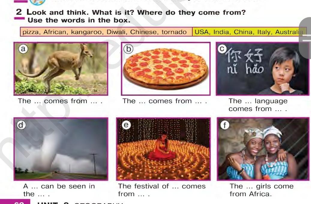 A) The kangaroo comes from Australia. b) The pizza comes from Italy c) The Chines language comes from China d) A tornado can be seen in the USA e) The festival of Diwali comes from India f) The African girls come from Africa